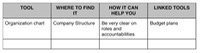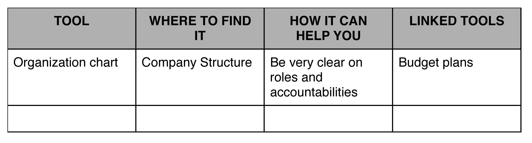 Much of the structure around you is actually the basis of your Toolkit. Take for example your past courses, education, organization structure, dress code, safety rules and company or social website. These are all tools at your disposal. Both the organizations and your Values, Vision, Strategy and Metrics are all key drivers of your and your staff behaviors. How well do you know and use them?